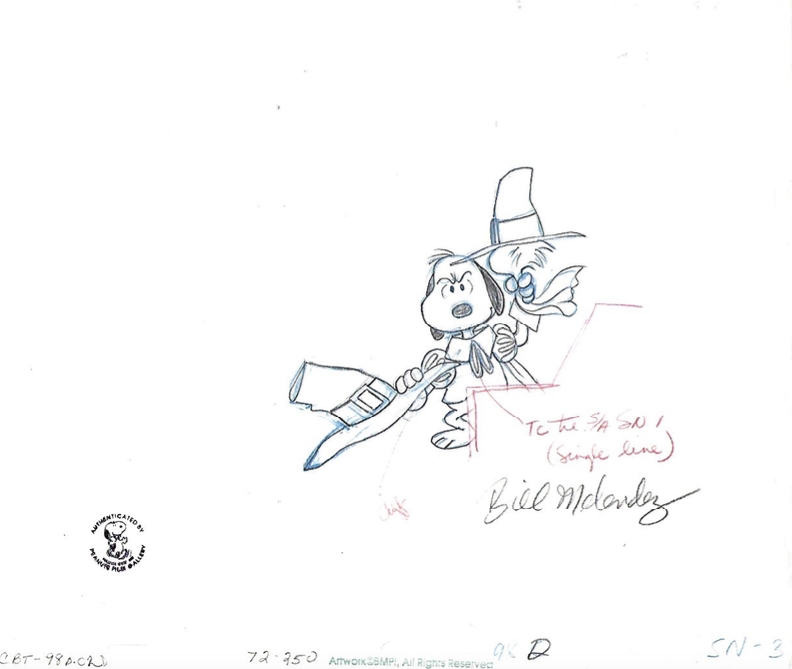 This is an original production drawing that has been personally signed by the late Bill Melendez. This was used in the making of "A Charlie Brown Thanksgiving" 1973. Featured here is Snoopy and Woodstock.