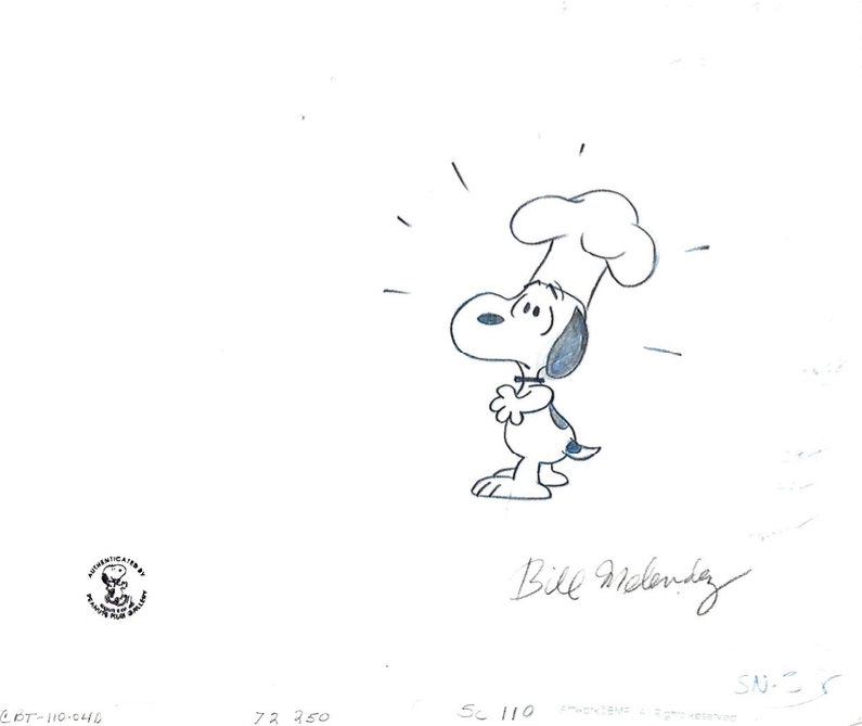 This is an original production drawing that has been personally signed by the late Bill Melendez. This was used in the making of "A Charlie Brown Thanksgiving" 1973. Featured here is Snoopy and Woodstock.