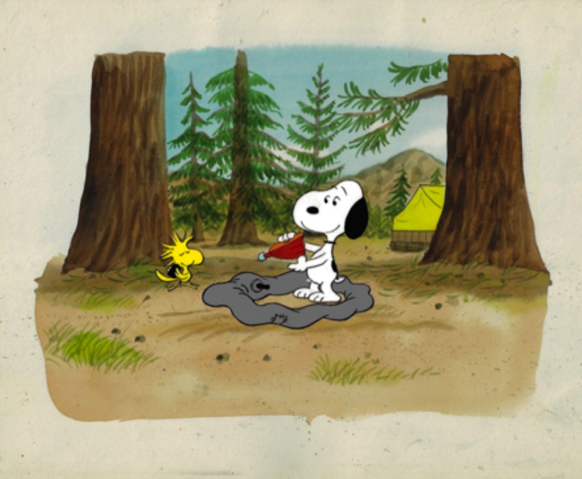 This is an original production cel set-up mounted on key master background, with animator's original production drawing(s). This was used in making "Race for Your Life, Charlie Brown" 1977. Featured here are Snoopy and Woodstock.