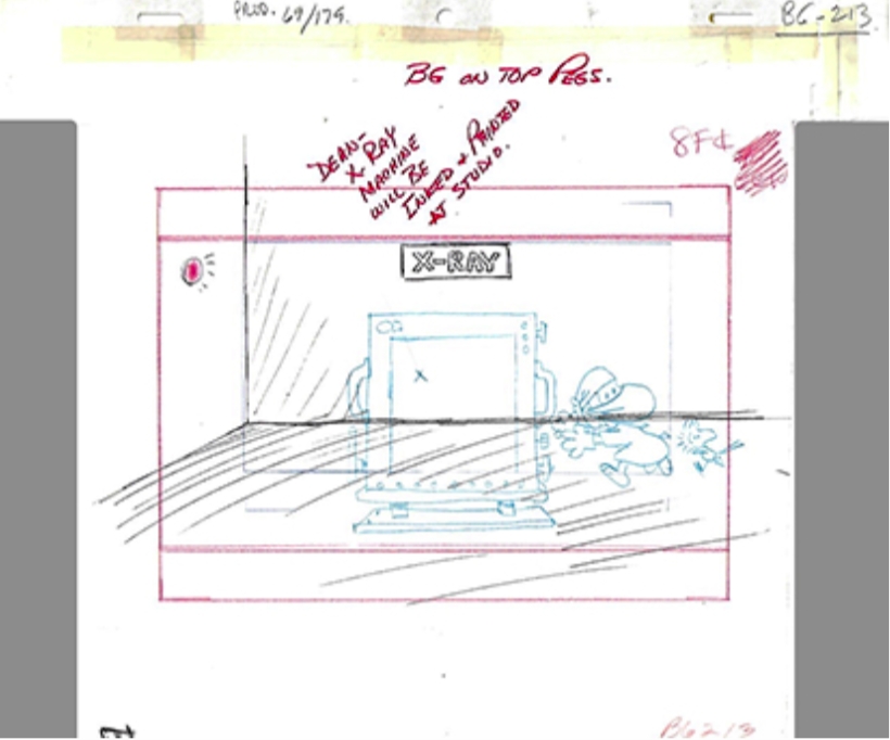 This is an original scene background layout drawing with character placements. Note: this drawing was re-pegged at top and drawing is smaller than registration strip of paper. This was used in making "Snoopy Come Home" 1972. Featured here are Woodstock and Snoopy.