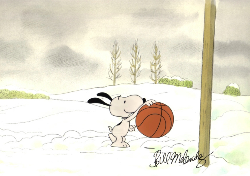 This is an original hand painted production model cel with matching animator's drawings. Both are personally signed by the late Bill Melendez. This was used in making "I Want a Dog for Christmas, Charlie Brown", 2003. Model cels are selected by Bill and used to work with animators to refine the cel color throughout the production. Featured here is Charlie Brown, Snoopy and Rerun.