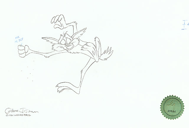 This is an original production drawing with hand painted 1 of 1 cel. This drawing was used in making "Chariots of Fur" 1994. Each has been personally signed by the late Chuck Jones. Featured here is Wile E. Coyote.