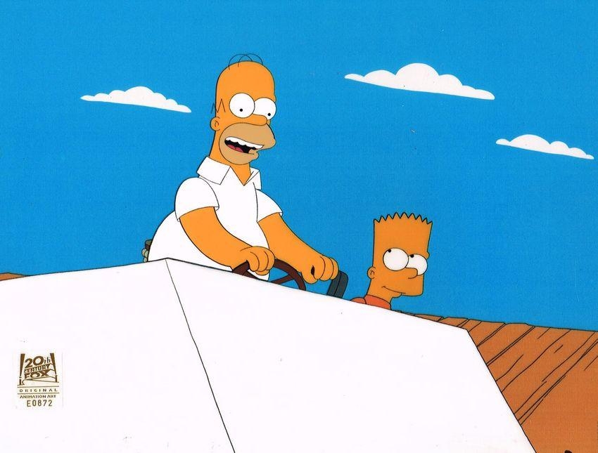 This is an original hand painted production cel used in making an episode of "The Simpsons". Episode DABF03 title "Sweets and Sour Marge", January 20,2002. In this episode Springfield is declared `the fattest town on Earth' when Homer's attempt to create the world's biggest human pyramid goes wrong. Marge's crusade to improve the town's health then leads to sugar being banned. Featured here are Homer Simpson and Bart Simpson.