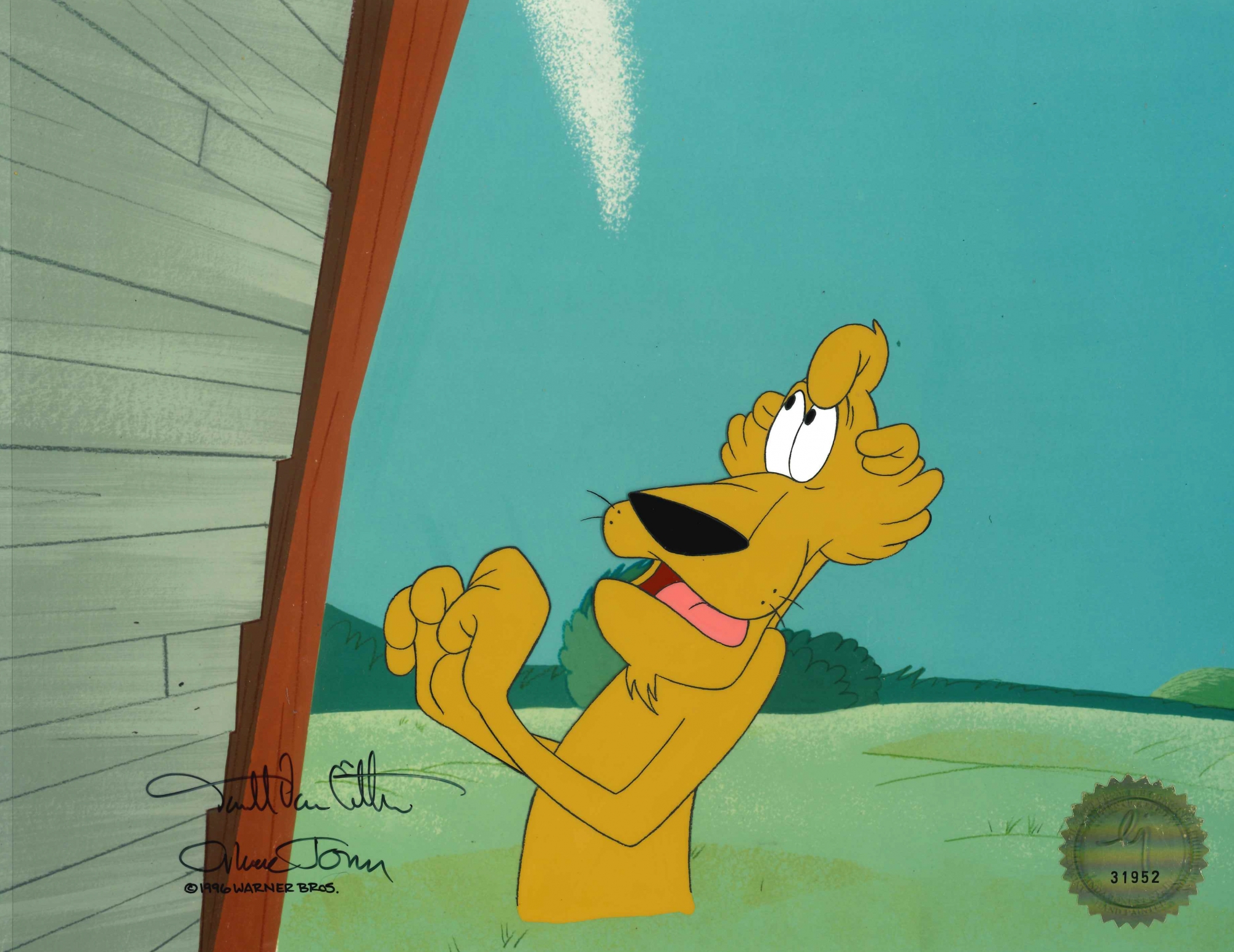This is an original hand painted production cel from "Pullet Surprise" featuring Pete Puma. This is personally signed by both Chuck Jones and Darrell Van Citters.