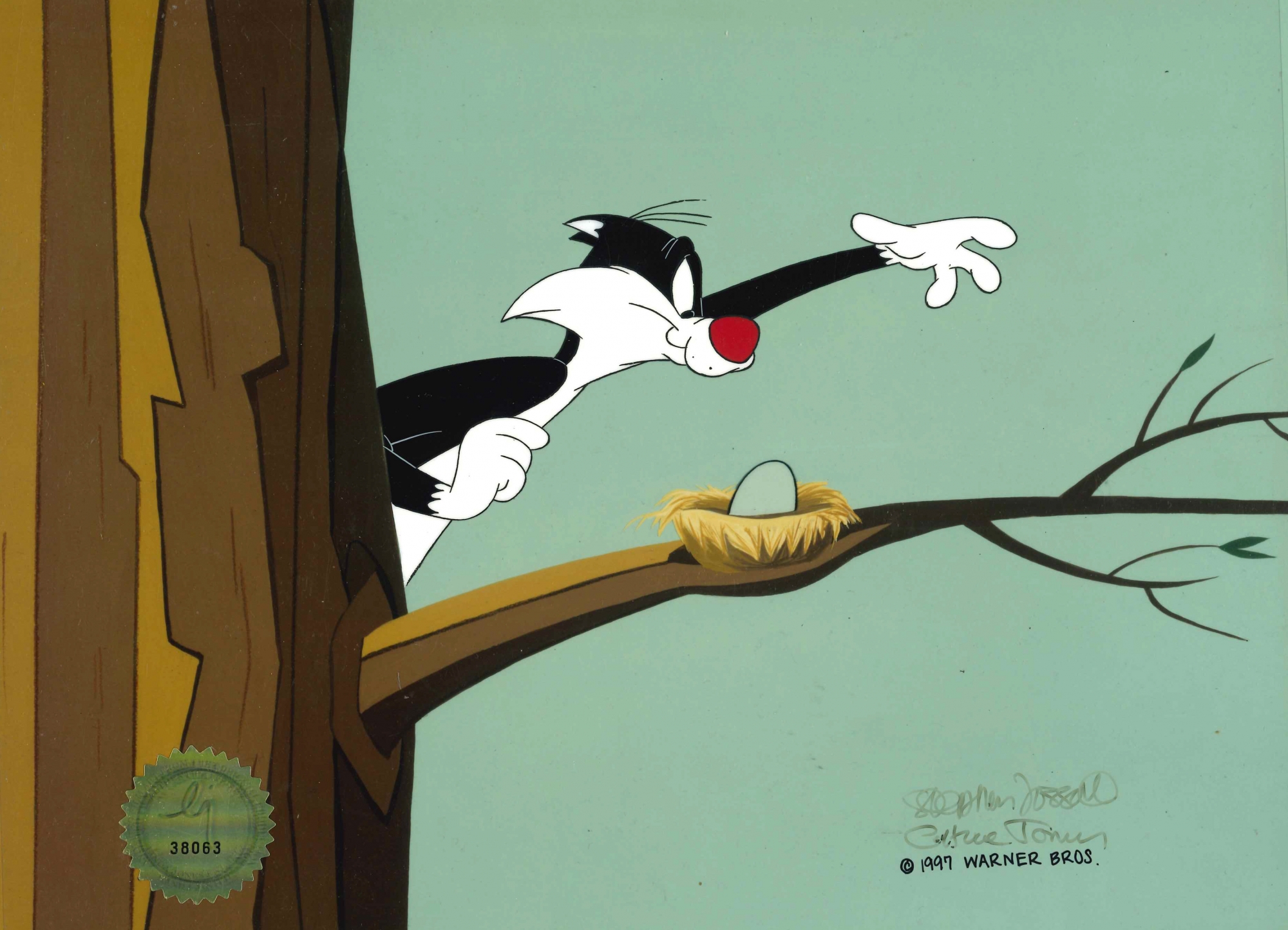 This is an original hand painted production cel from "Father of the Bird" 1997 featuring Sylvester. "Father of the Bird" is a traditionally animated Looney Tunes short film directed and co-produced by Stephen A. Fossati and produced by Chuck Jones and Linda Jones Clough starring Sylvester. This is personally signed by both Chuck Jones and Stephen Fossati. Note: signatures are faded.