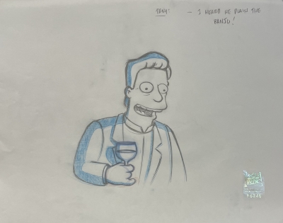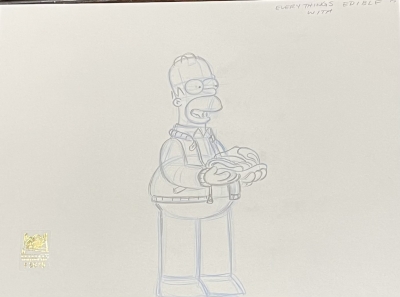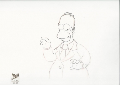 SOLD. This is an original production drawing used in making "The Simpsons" Episode 3F15 "A Fish Called Selma" March 24, 1996. In this episode actor Troy McClure is in desperate need of some good publicity following his implication in a sordid sea-life scandal, so he arranges a sham wedding with Selma. Featured here is Homer Simpson.
