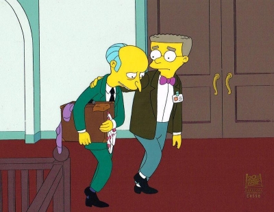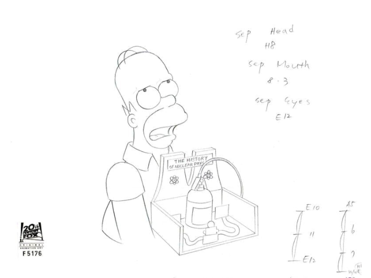 *SOLD* This is an original production drawing used in making "The Simpsons" Episode FABF21 "Fat Man and Little Boy" December 12, 2004. In this episode Bart writes slogans on T-shirts, catches the attention of Goose Gladwell, a gag-gift entrepreneur, and soon becomes a T-shirt mogul. Homer feels he no longer has a place in the family when Bart becomes the breadwinner. Featured here is Homer Simpson.