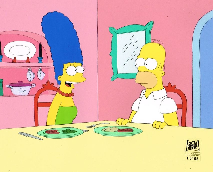 *SOLD* This is an original hand painted production cel used in making an episode of "The Simpsons". Episode 5F21 title "The Wizard of Evergreen Terrace" September 20, 1998. Inspired by Thomas Alva Edison, Homer tries to overcome a midlife depression by inventing a string of useless gadgets. Featured here are Homer Simpson and Marge.