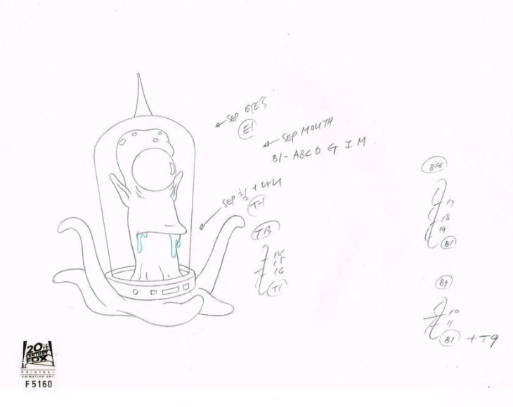 This is an original production drawing used in making "The Simpsons" Episode BABF21 "Treehouse of Horror Xl" November 1, 2000. In this episode Satan kicks Homer out of hell, dolphins take over Springfield, and the Simpsons discover the dark side of fairy tales. Featured here is Kodos or Kang.