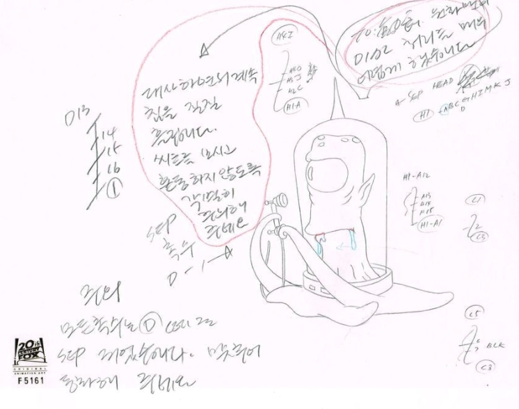 This is an original production drawing used in making "The Simpsons" Episode BABF21 "Treehouse of Horror Xl" November 1, 2000. In this episode Satan kicks Homer out of hell, dolphins take over Springfield, and the Simpsons discover the dark side of fairy tales. Featured here is Kodos or Kang.