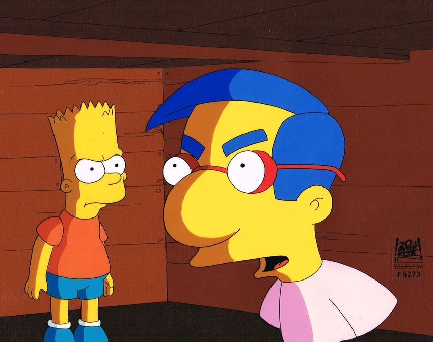 This is an original production cel used in making an episode of "The Simpsons". Episode 7F21 "Three Men and a Comic Book" May 9, 1991 season 2. Featured here is Bart Simpson and Milhouse.