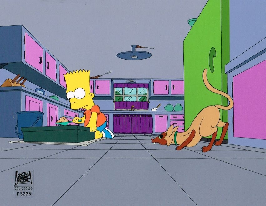 This is an original production cel used in making an episode of "The Simpsons". Episode 7F21 "Three Men and a Comic Book" May 9, 1991 season 2. Bart, Milhouse and Martin pool their resources to buy the first-ever edition of the "Radioactive Man" comic book, but refusing to trust each other, they spend a stormy night together with it in the treehouse. Featured here is Bart Simpson.