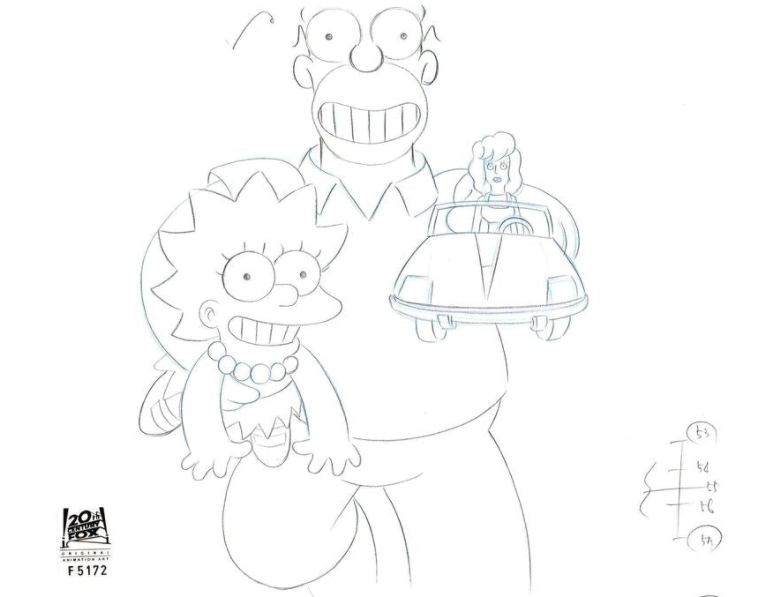 This is an original production drawing used in making "The Simpsons" Episode FABF21 "Fat Man and Little Kid" December 12, 2004. When Bart writes slogans on T-shirts, he catches the attention of Goose Gladwell, a gag-gift entrepreneur, and soon becomes a T-shirt mogul; Homer feels he no longer has a place in the family when Bart becomes the breadwinner. Featured here are Homer Simpson and Lisa Simpson.