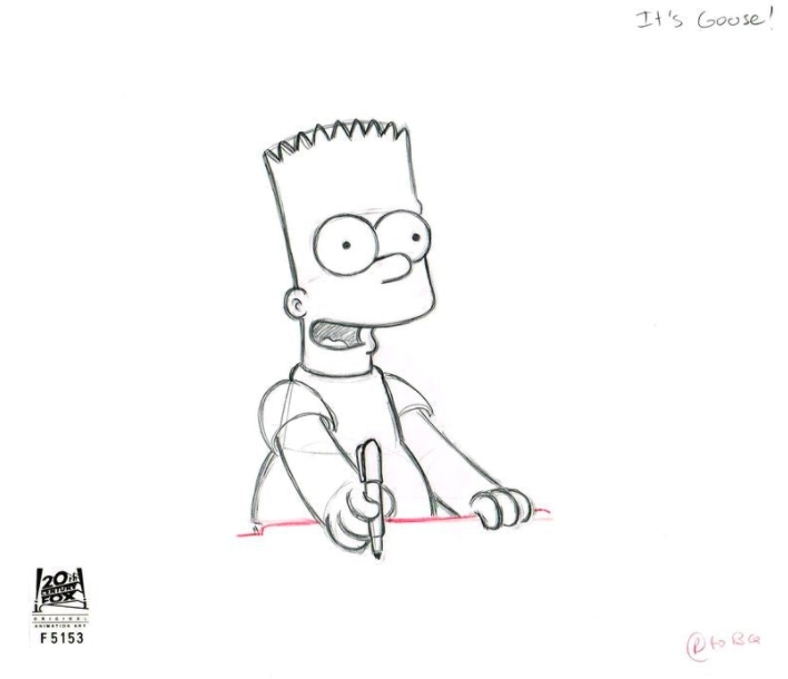This is an original production drawing used in making "The Simpsons" Episode FABF21 "Fat Man and Little Kid" December 12, 2004. When Bart writes slogans on T-shirts, he catches the attention of Goose Gladwell, a gag-gift entrepreneur, and soon becomes a T-shirt mogul; Homer feels he no longer has a place in the family when Bart becomes the breadwinner. Featured here is Bart Simpson.