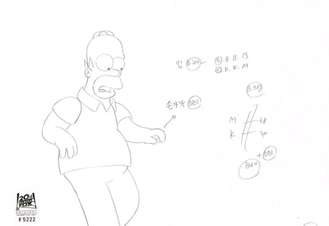 This is an original production drawing used in making "The Simpsons" Episode YABF09 "E My Sports" 3/17/19. As Bart begins to excel in video game competitions, Homer discovers a passion for coaching him; Lisa attempts to bring Homer back to reality, but the plan causes chaos. Featured here is Homer Simpson.