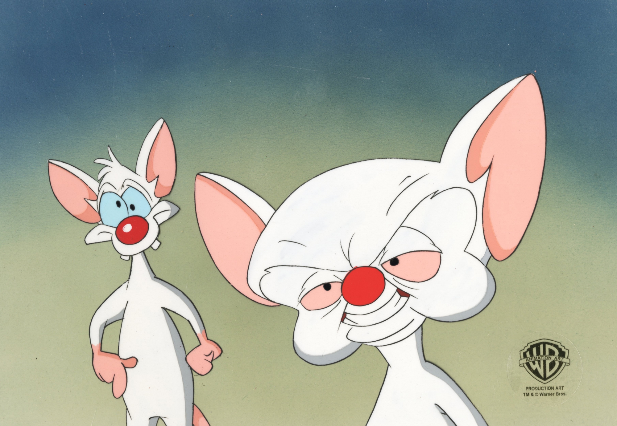 This is an original production cel used in making "Pinky and the Brain" 1995. Pinky and the Brain are genetically enhanced laboratory mice who reside in a cage in the Acme Labs research facility. Brain is highly intelligent, self-centered and scheming, while Pinky is good-natured but feeble-minded. Featured here are Pinky and the Brain.