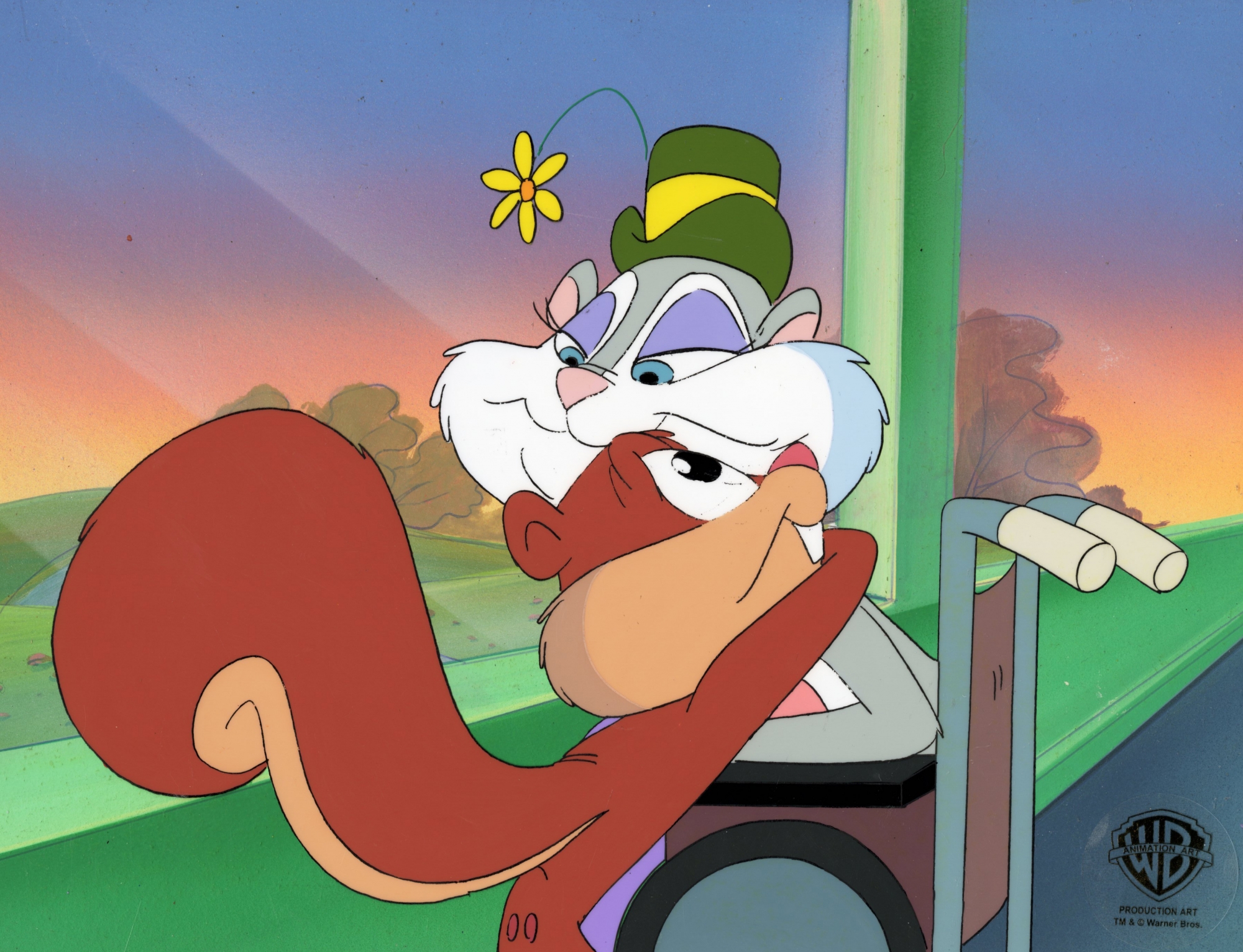 This is an original production cel used in making "Animaniacs". Featured here are Slappy and Skippy. This is on an original hand painted production background.