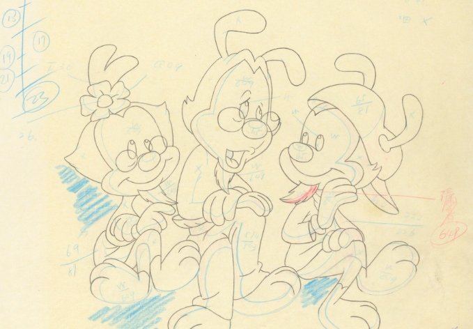 This is an original production drawing used in making "Animaniacs". Featured here are Wakko, Yakko and Dot.