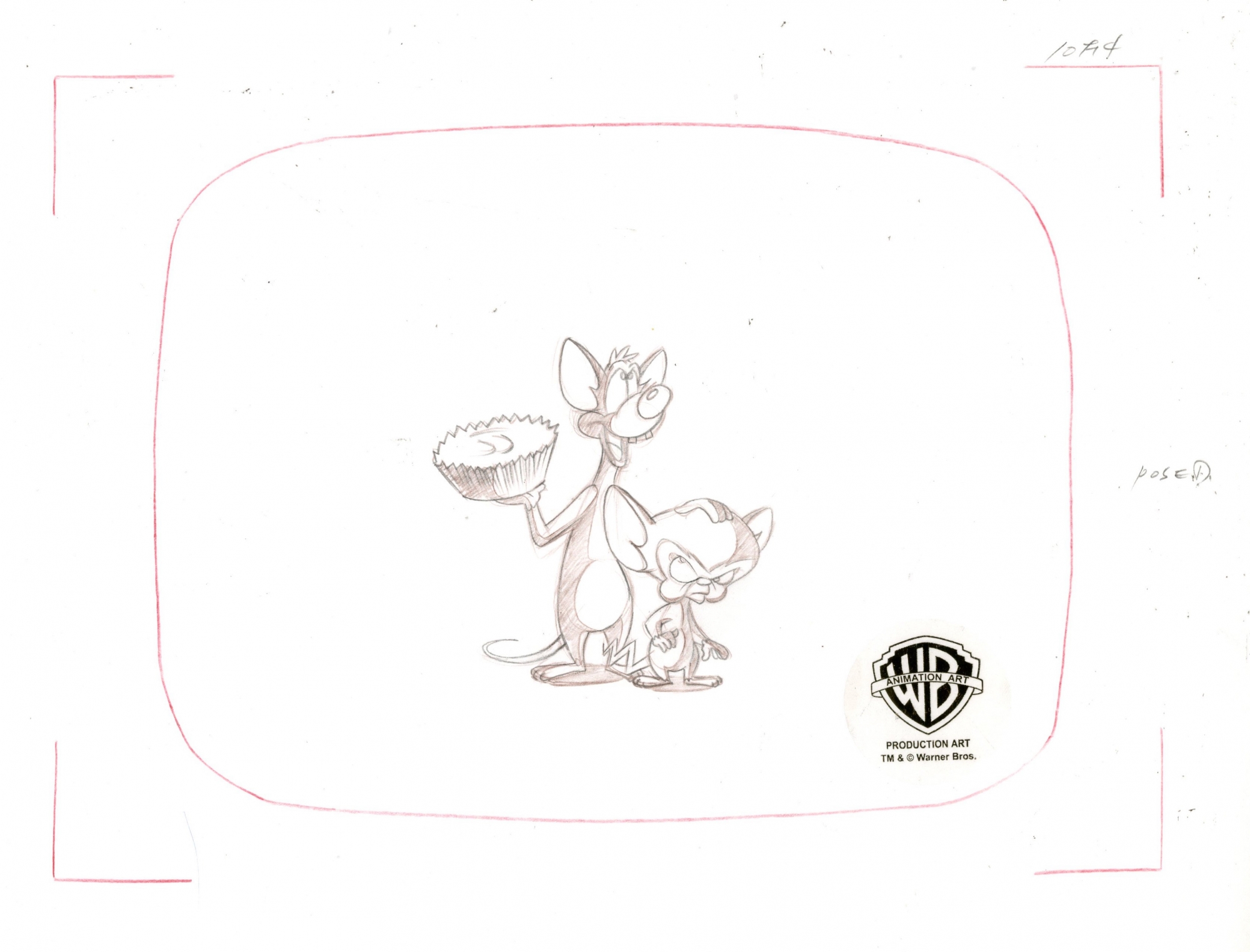 This is an original production drawing used in making "Pinky and the Brain" 1995. Pinky and the Brain are genetically enhanced laboratory mice who reside in a cage in the Acme Labs research facility. Brain is highly intelligent, self-centered and scheming, while Pinky is good-natured but feeble-minded. Featured here are Pinky and the Brain.