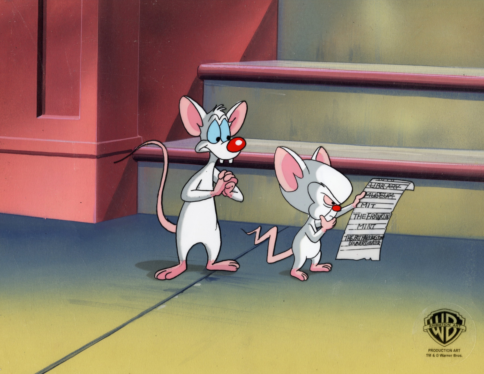 This is an original production cel on hand painted production background used in making "Pinky and the Brain" 1995. Pinky and the Brain are genetically enhanced laboratory mice who reside in a cage in the Acme Labs research facility. Brain is highly intelligent, self-centered and scheming, while Pinky is good-natured but feeble-minded. Featured here are Pinky and the Brain.