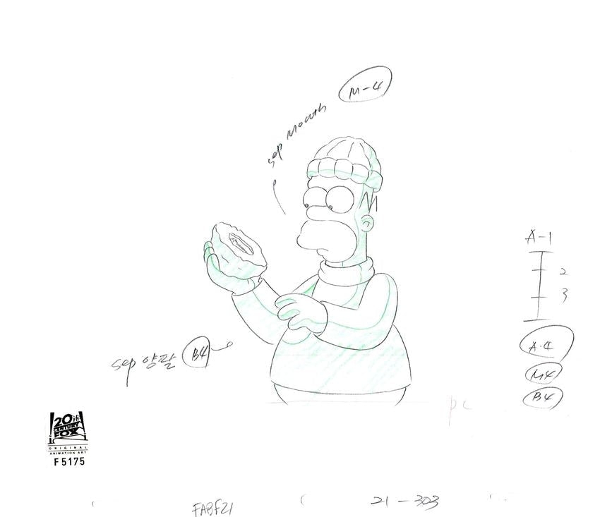 This is an original production drawing used in making "The Simpsons" Episode FABF21 "Fat Man and Little Boy" December 12, 2004. In this episode Bart writes slogans on T-shirts, catches the attention of Goose Gladwell, a gag-gift entrepreneur, and soon becomes a T-shirt mogul. Homer feels he no longer has a place in the family when Bart becomes the breadwinner. Featured here is Homer Simpson.