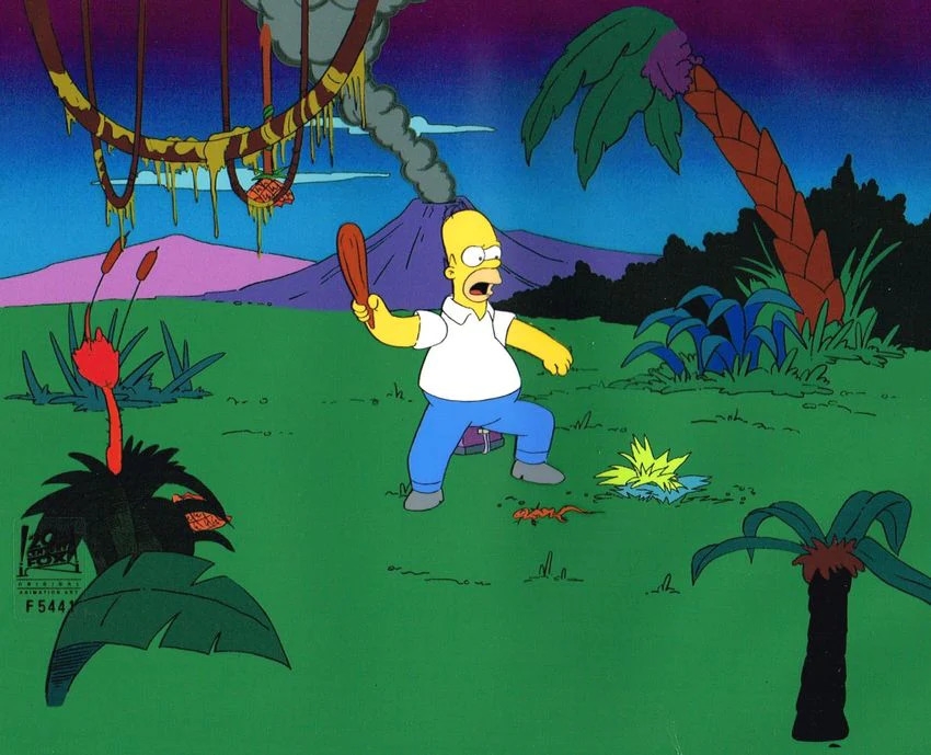* SOLD* This is an original hand painted production cel used in making an episode of "The Simpsons". Episode title "Treehouse of Horror V" Oct. 30, 1994. The Simpsons become winter caretakers at Mr Burns' mountain mansion, where Homer is driven mad by the lack of beer and TV. Homer also turns the toaster into a time machine and sets the universe on a crash course with destruction, and Bart and Lisa discover that the teachers are eating their pupils. Featured here is Homer Simpson.
