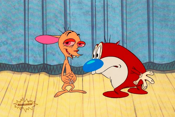This is an original hand painted production cel used in making an episode of "The Ren & Stimpy Show" 1991. Episode title "The Big Shot" Farewell Segment August 11, 1991. The "farewell" segment is often considered by fans as one of the best moments of the entire series. Featured here is Ren and Stimpy.
