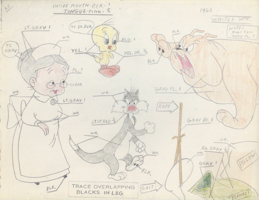 This is a hand colored color model sheet used in making the 1957 Warner Bros. Looney Tunes cartoon "Greedy for Tweety" directed by Friz Freleng. The short was released on September 28, 1957 and stars Tweety and Sylvester. Tweety, Sylvester and Hector find themselves in the hospital as patients after being injured in one of their chases, and the cat and dog still can't resist causing trouble there. A color model is a rare first generation copy from the original master. In the early days of cartoon production the photocopying and reproduction techniques of today did not exist. This first generation copy was most likely created using a spirit copier, the most common means of reproduction in the 40's and 50's. First generation color model sheets were distributed to all principal animators working on early cartoon productions. It was their guide from the Master Animator. A truly rare find.