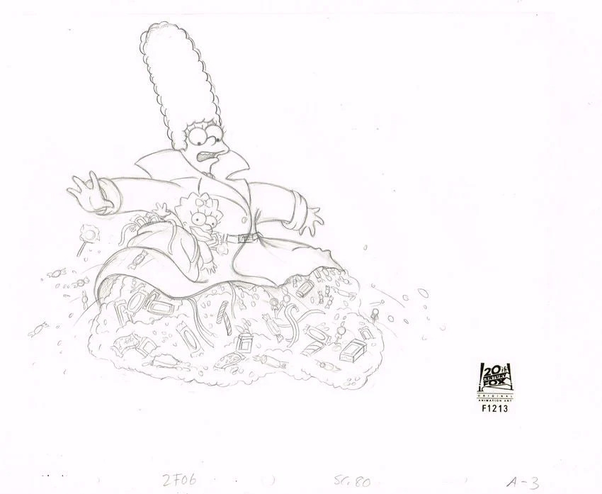 This is an original production drawing used in making "The Simpsons" Episode 2F06 "Homer Bad Man" November 27, 1994. Homer and Marge hire Ashley Grant, a feminist graduate student, to babysit Bart, Lisa and Maggie while they attend a candy convention. Homer outfits Marge with an oversized trench coat, hoping to smuggle out as much candy as possible, including a rare gummy Venus de Milo. Featured here are Marge Simpson and Maggie Simpson.
