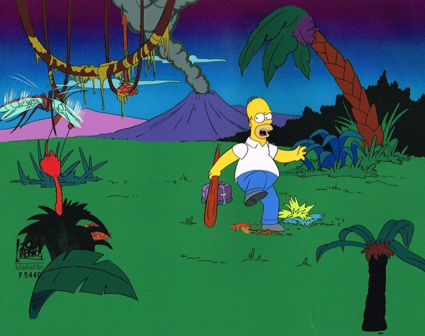 This is an original hand painted production cel used in making an episode of "The Simpsons". Episode title "Treehouse of Horror V" Oct. 30, 1994. The Simpsons become winter caretakers at Mr Burns' mountain mansion, where Homer is driven mad by the lack of beer and TV. Homer also turns the toaster into a time machine and sets the universe on a crash course with destruction, and Bart and Lisa discover that the teachers are eating their pupils. Featured here is Homer Simpson.