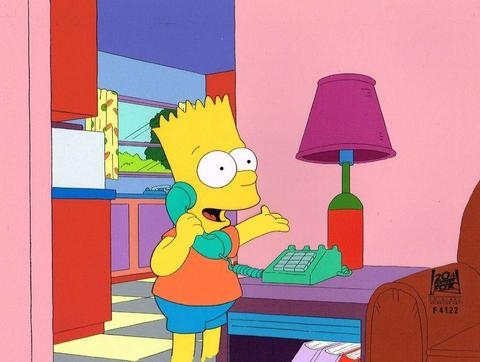 This is an original hand painted production cel used in making an episode of "The Simpsons". Episode 7F24 title "Stark Raving Dad" September 19, 1991. Featured here is Bart Simpson.