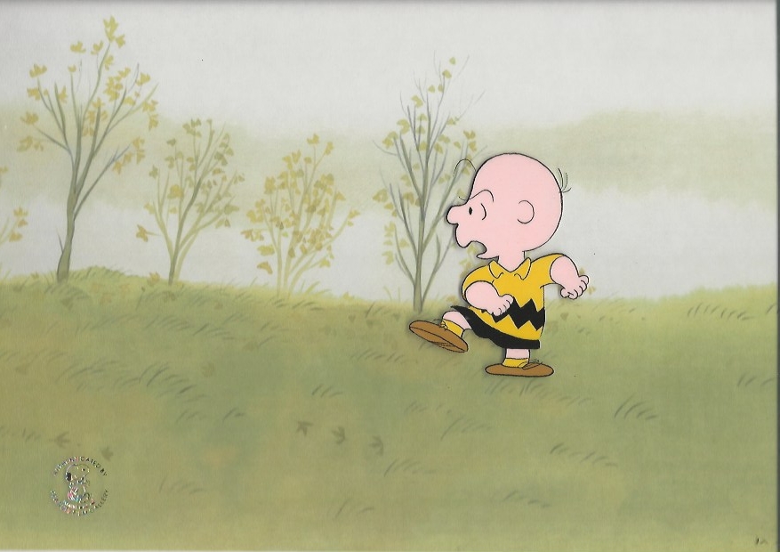 This is a hand painted production cel of Charlie Brown. This was used in making "A Charlie Brown Thanksgiving" 1973 scene 006.077. Peppermint Patty invites everyone to Charlie Brown's for Thanksgiving, even though he's going to see his grandmother. Snoopy decides to cook his own version of a Thanksgiving meal with help from his friends. This cel comes with the animator's original drawing. You can purchase this along with the cel of Lucy holding the football...a great pairing. Featured here is Charlie Brown.