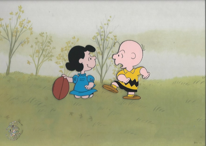 This is an original hand painted production cel set. We have put 2 cels together to make the classic Peanuts football scene. You can frame them separately or together as shown. Featured here are Charlie Brown and Lucy Van Pelt.