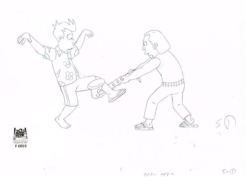 This is an original production drawing used in making an episode of "Futurama". Episode 7ACV17 title "Fry and Leela's Big Fling". Original air date June 19, 2013 (Season 7). While Fry and Leela organize a romantic getaway to a tropical hotspot, the rest of the crew make their way to Simian 7. Featured here is Fry.