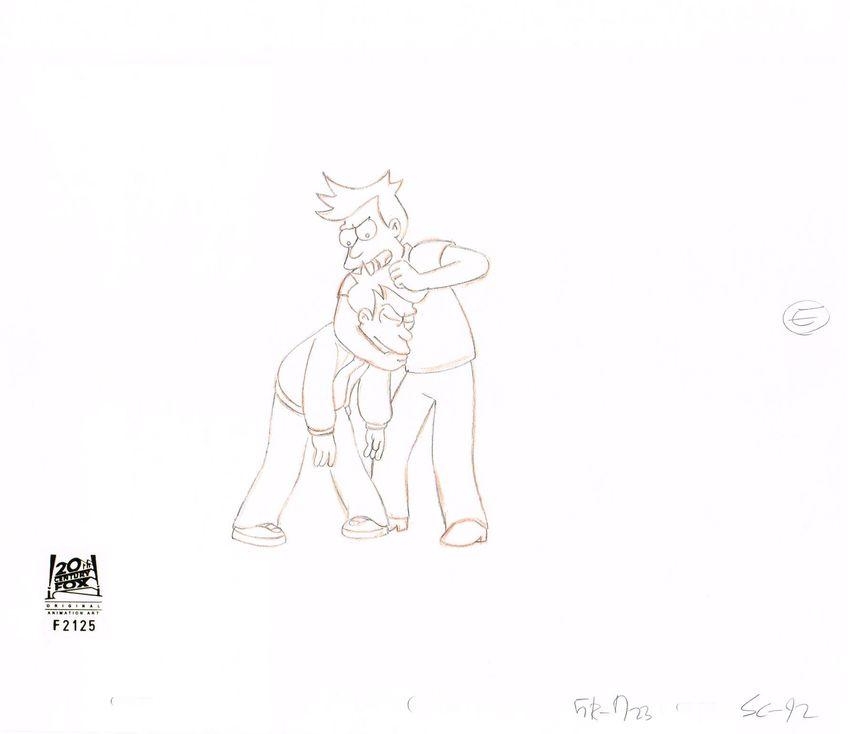 This is an original production drawing used in making an episode of "Futurama". Episode 7ACV23 title "Game of Tones". Original air date August 14, 2013 (Season 7). In this episode Fry travels back in time to 31 December 1999 to decipher the meaning behind a mysterious alien melody. He also has the chance to see the life he left behind, and must decide if he wants to return to the future. Featured here is Fry.