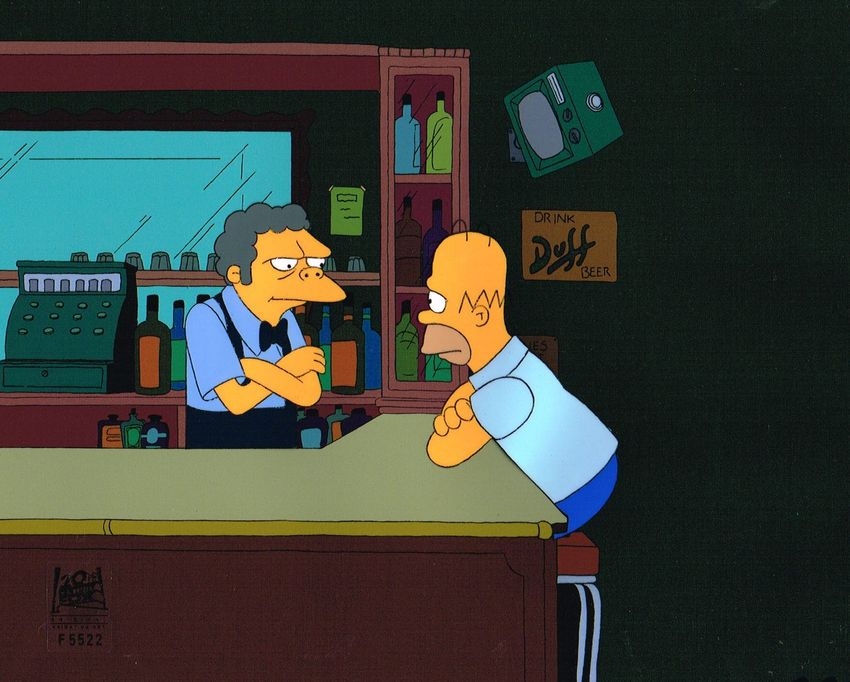 This is an original hand painted production cel used in making an episode of "The Simpsons". Episode 8F08 titled "Flaming Moe's" November 21, 1991. In this episode a local bartender steals Homer's secret recipe for a bizarre drink called the "Flaming Homer" and becomes rich. Featured here are Homer Simpson and Moe.