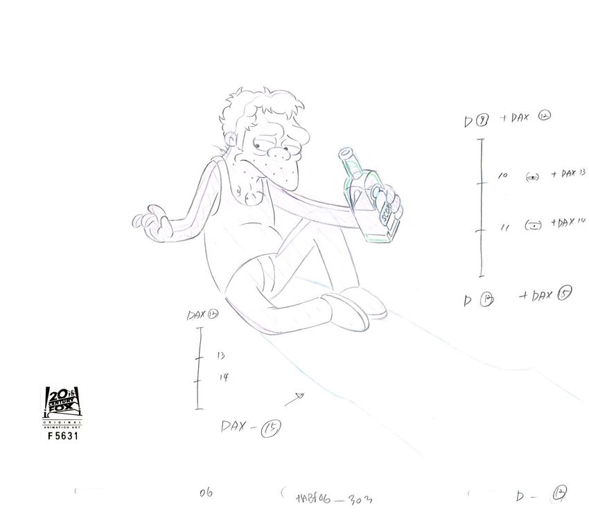 This is an original production drawing used in making an episode of "The Simpsons". Episode HABF06 titled "The Seemingly Never- Ending Story" March 12, 2006. Lisa tells an epic tale. Chased by a sheep, she meets Burns, who tells her about a Texan and a scavenger hunt, which results in Burns losing the power plant, but how does Bart's geography test fit in?. Featured here is Moe.