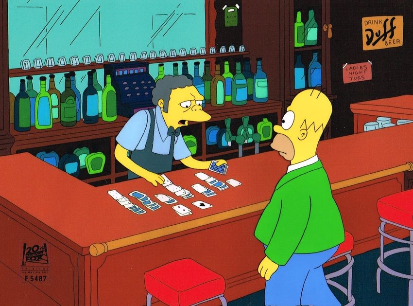 This is an original hand painted production cel used in making an episode of "The Simpsons". Episode 8F08 titled "Flaming Moe's" November 21, 1991. In this episode a local bartender steals Homer's secret recipe for a bizarre drink called the "Flaming Homer" and becomes rich. Featured here are Homer Simpson and Moe.