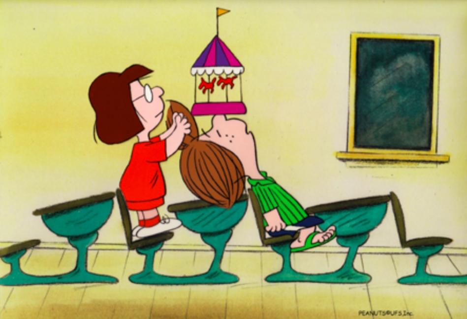This is an original hand painted production cel set-up with 4 matching animator's drawing used in making "The Charlie Brown and Snoopy Show: School Days" 1983. Featured here are Peppermint Patty and Marcy.