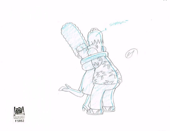 This is an original production drawing used in making The Simpsons. Episode title "Catch 'Em If You Can" April 25, 2004. In the episode Marge and Homer are caught enjoying a romantic weekend in Miami instead of a boring family visit to Dayton. Meanwhile Bart and Lisa embark on a cross-country journey to hunt them down and ruin their holiday. Grandpa, abandoned in Miami, enjoys the company of gay Miami swinger Raoul. Featured here are Homer Simpson and Marge Simpson.