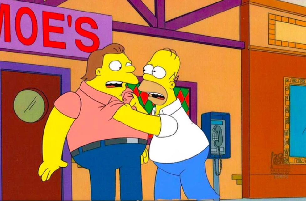 This is an original hand painted production cel. This was used in making an episode of "The Simpsons". Episode BABF14 titled "Days of Wine and D'oh'ses" April 9, 2000. In the episode Homer is upset when Barney quits drinking. Meanwhile, Bart and Lisa get into trouble when they enter a photo contest. Featured here are Homer Simpson and Barney Gumble.