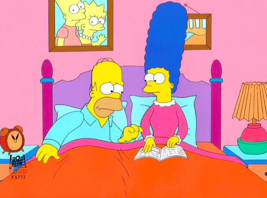 This is an original hand painted production cel. This was used in making an episode of "The Simpsons". Episode BABF14 titled "Days of Wine and D'oh'ses" April 9, 2000. In the episode Homer is upset when Barney quits drinking. Meanwhile, Bart and Lisa get into trouble when they enter a photo contest. Featured here are Homer Simpson and Marge Simpson...also Lisa and Bart!