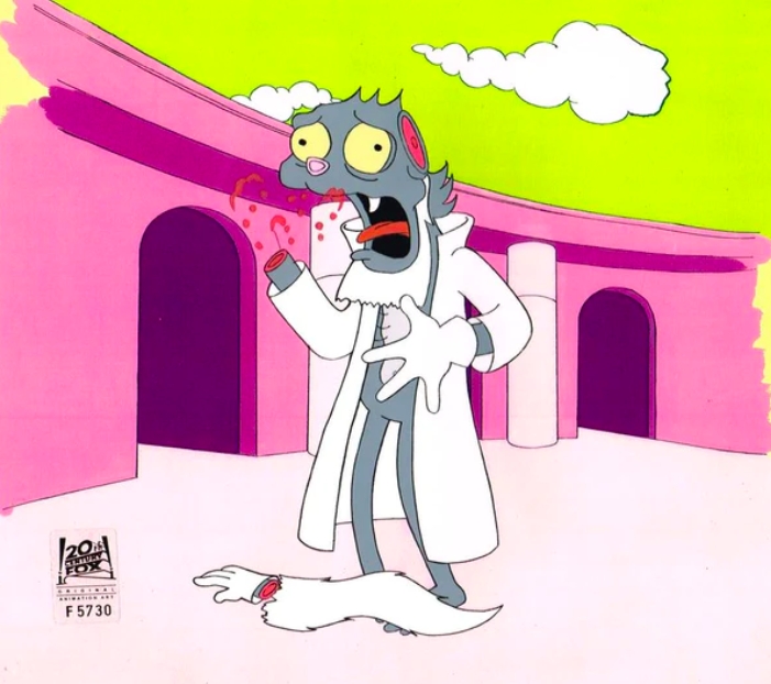 This is an original hand painted production cel. This was used in making an episode of "The Simpsons". Episode 1F22 titled "Bart of Darkness" September 4, 1994. Bart and Lisa use not-so-idle threats to convince Homer to buy a swimming pool, and Bart suspects Flanders has killed his wife when he spies on him through the rear window. Featured here Scratchy.