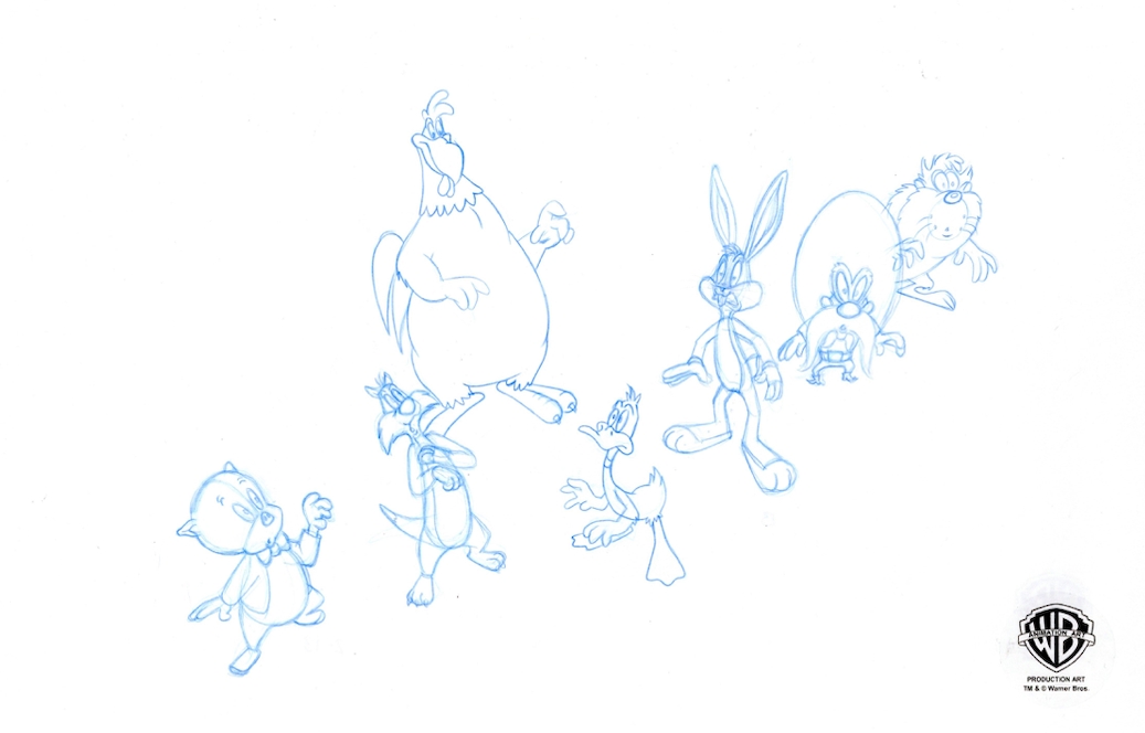 This is an original production drawing of Bugs Bunny, Foghorn Leghorn, Sylvester, Yosemite Sam, Daffy Duck, Taz, Porky Pig. Note...this is a unique double sided drawing.