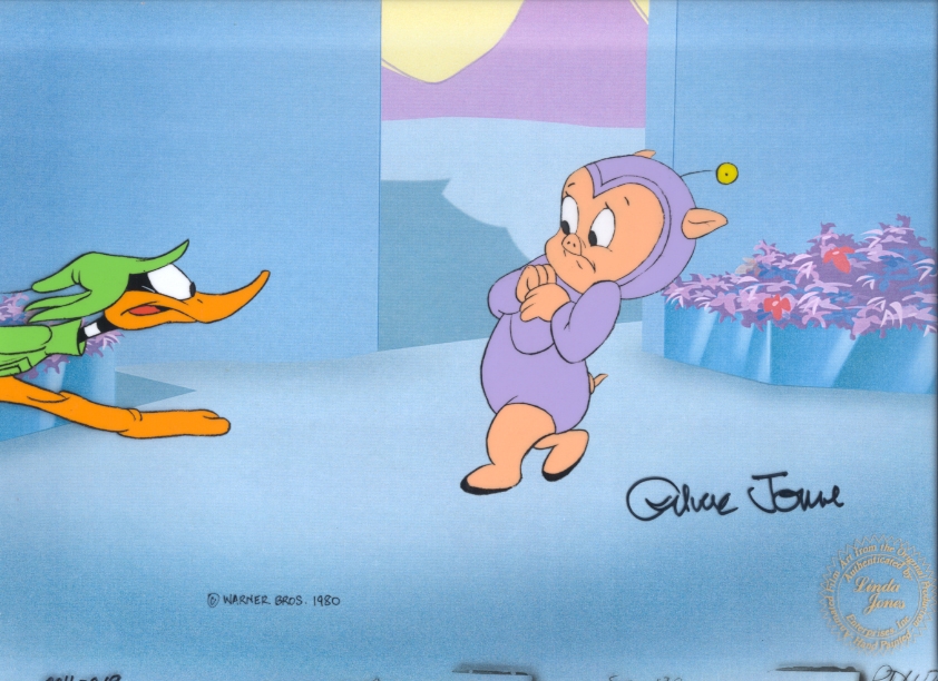 This is an original hand painted production cel used in making "Duck Dodgers and the Return of the 24 1/2 Century" 1980. This was personally signed by Chuck Jones. Featured here are Porky Pig and Daffy Duck.