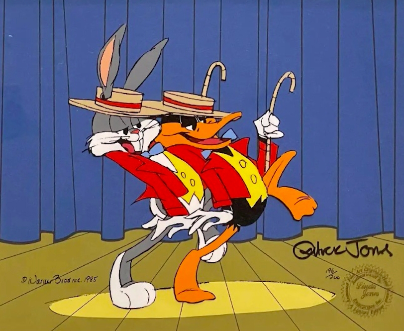 This is a hand painted limited edition cel featuring Bugs Bunny and Daffy Duck. A classic! This is personally signed by Chuck Jones. Sold out edition...only one available.