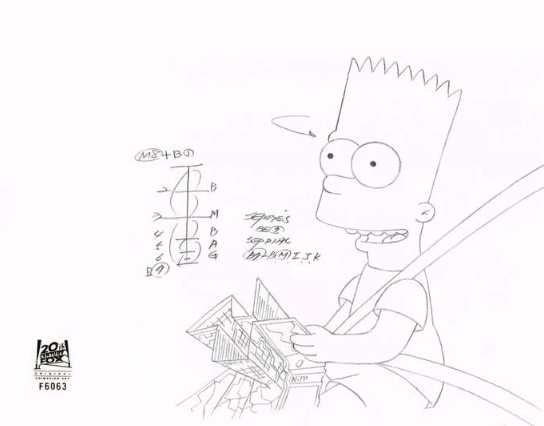 This is an original production drawing used in making "The Simpsons" Episode 3F17 "Bart on the Road" March 31, 1996. Featured here is Bart Simpson.