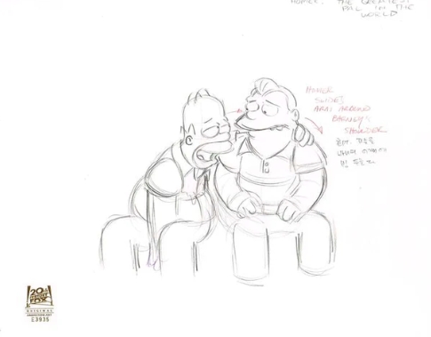 This is an original production drawing used in making "The Simpsons" Episode title "Days of Wine and D'oh'ses" April 9, 2000. Featured here are Homer Simpson and Barney Gumble.