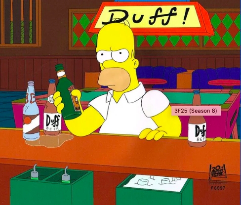 This is an original hand painted production cel used in making an episode of "The Simpsons". Episode 3F25 titled "The Springfield Files" January 12, 1997. In this episode FBI agents Fox Mulder and Dana Scully visit Springfield to investigate an alien that Homer claims to have seen in the woods. Featured here is Homer Simpson.