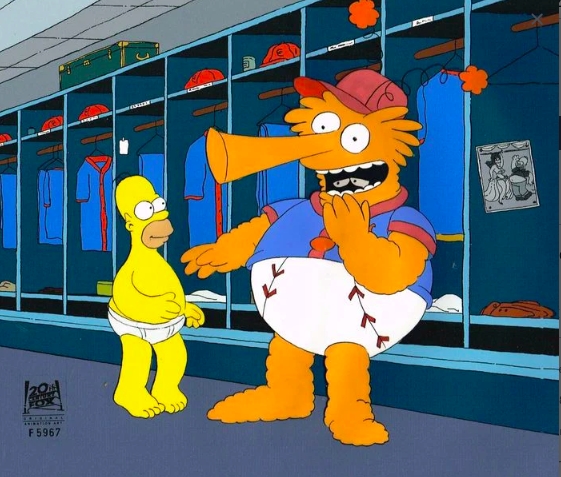 This is an original hand painted production cel used in making an episode of "The Simpsons". Episode 7F05 title "Dancin' Homer" November 8, 1990. in the episode Homer becomes the local baseball team's mascot after impressing a crowd is with his dance to Baby Elephant Walk. Featured here is Homer Simpson and Capital City Goofball.